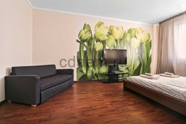 В квартире вся необходимая мебель и техника: шкаф для одежды, широкая кровать, диван раскладной, стиральная машина, электроплита, уголок кухонный, микроволновка, чайник, посуда, постельное белье, утюг, фен, домофон.